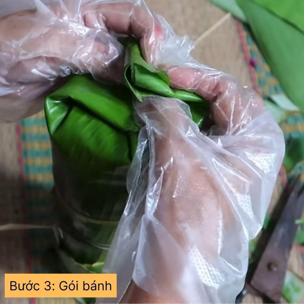 Trải lá chuối ra, cho các phần nếp đã ngâm màu lần lượt vào để tạo thành lớp màu xung quanh nhân. Đặt nhân đậu xanh vào giữa và bọc lại, gói chặt và buộc lạt chắc chắn.