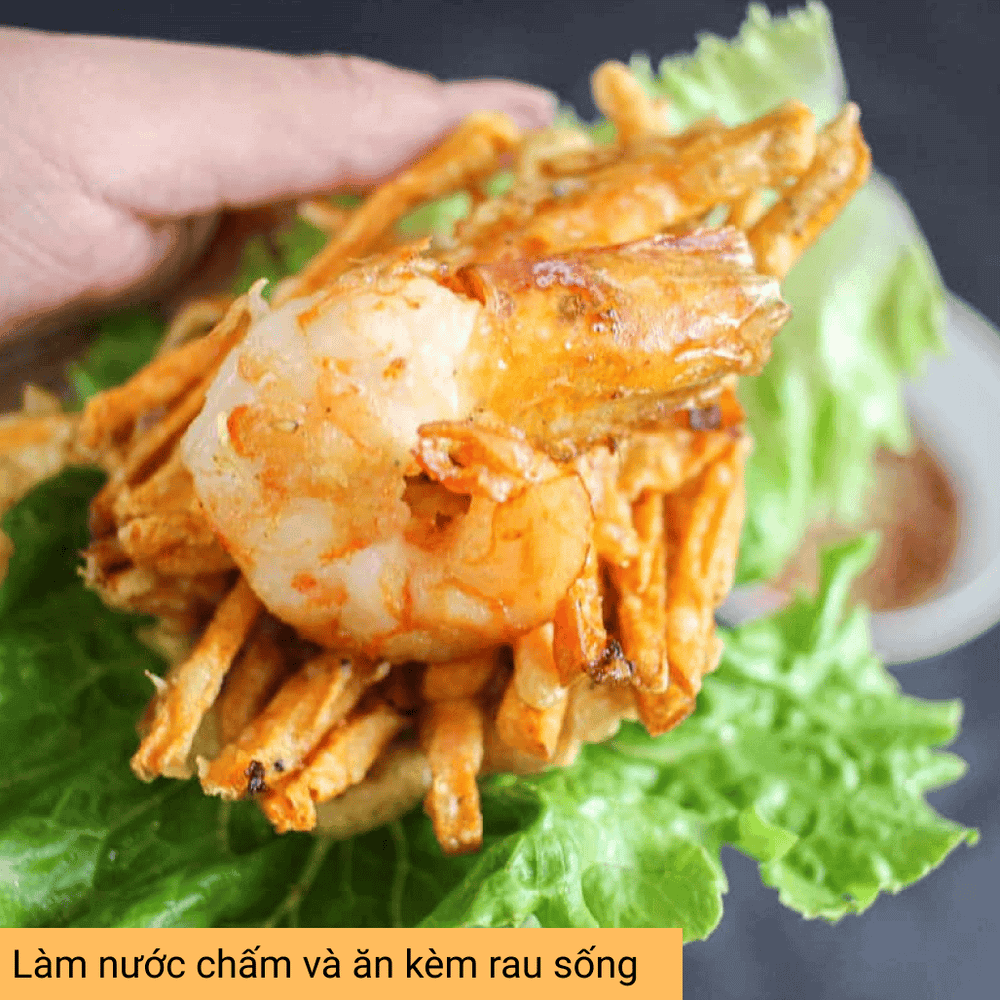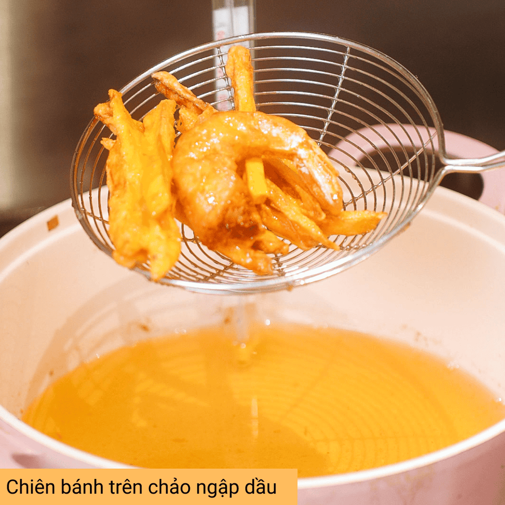 Múc một lượng khoai đã trộn bột, đặt một con tôm lên trên và thả vào chảo dầu nóng. Chiên ở lửa vừa đến khi bánh vàng giòn thì vớt ra để ráo dầu.