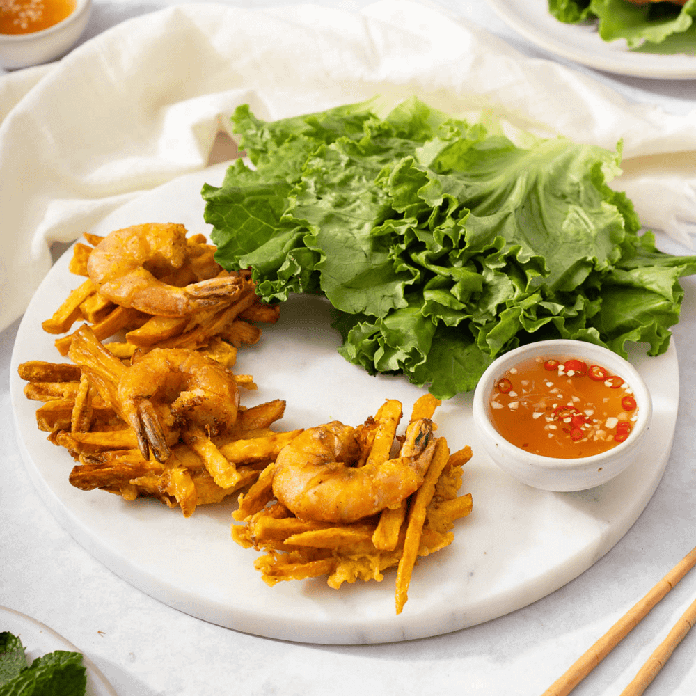 Thưởng thức bánh tôm chiên khoai lang giòn tan, vàng ươm, với vị ngọt của tôm tươi hòa quyện cùng khoai lang bùi bùi. Chấm kèm nước mắm chua ngọt và rau sống, món ăn này hứa hẹn sẽ làm bùng nổ vị giác của bạn.