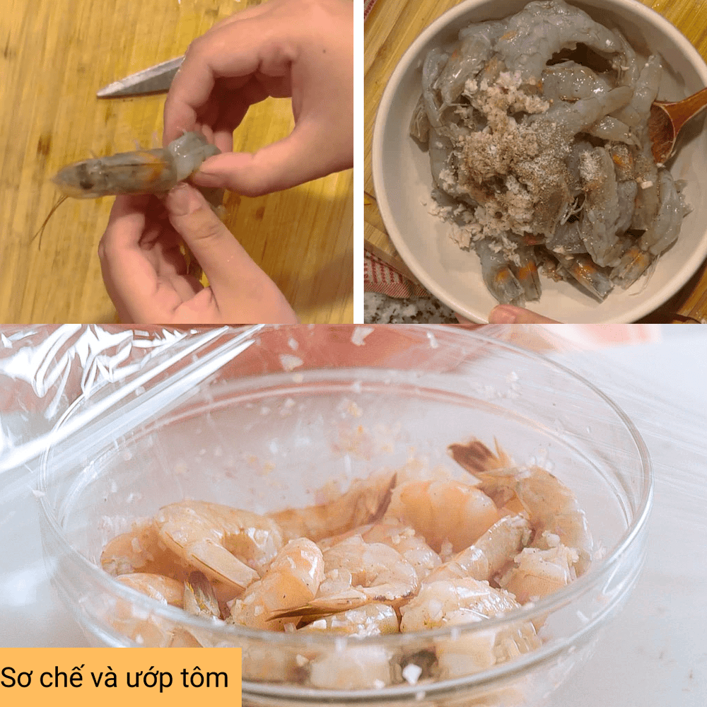 Rửa sạch tôm, bỏ đầu, lột vỏ (chừa đuôi để đẹp mắt) và ướp với một chút muối và tiêu.