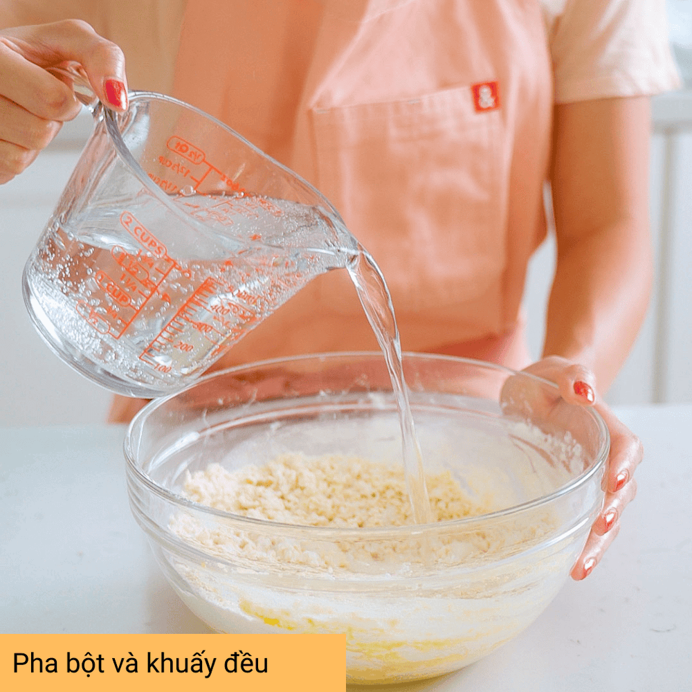 Trộn đều bột chiên giòn, bột mì, bột nở và muối trong tô lớn. Thêm nước lọc từ từ vào, khuấy đều cho đến khi hỗn hợp sánh mịn (không quá đặc).
