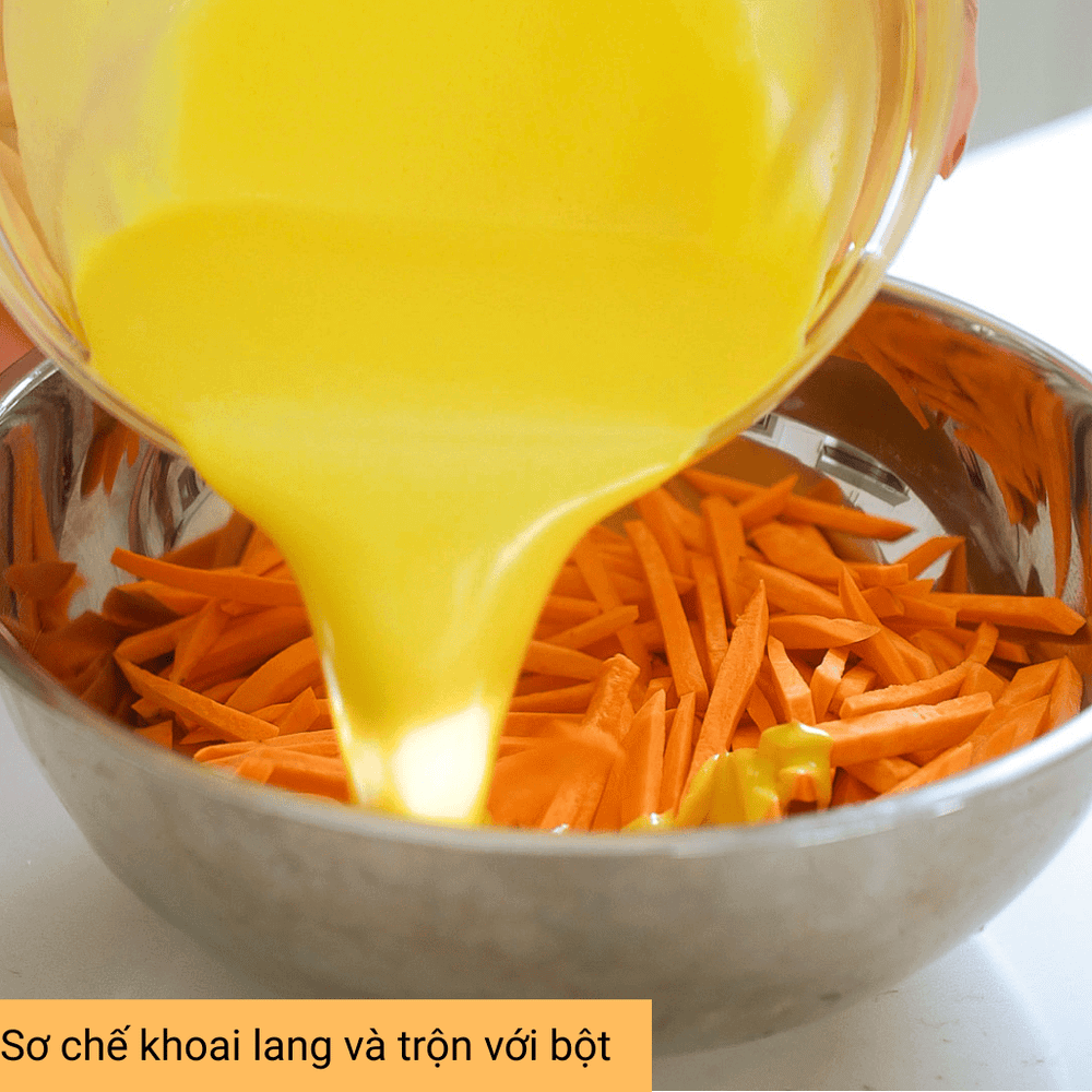Khoai lang gọt vỏ, rửa sạch và bào thành sợi dài. Sau đó cho bột đã pha vào và trộn đều.