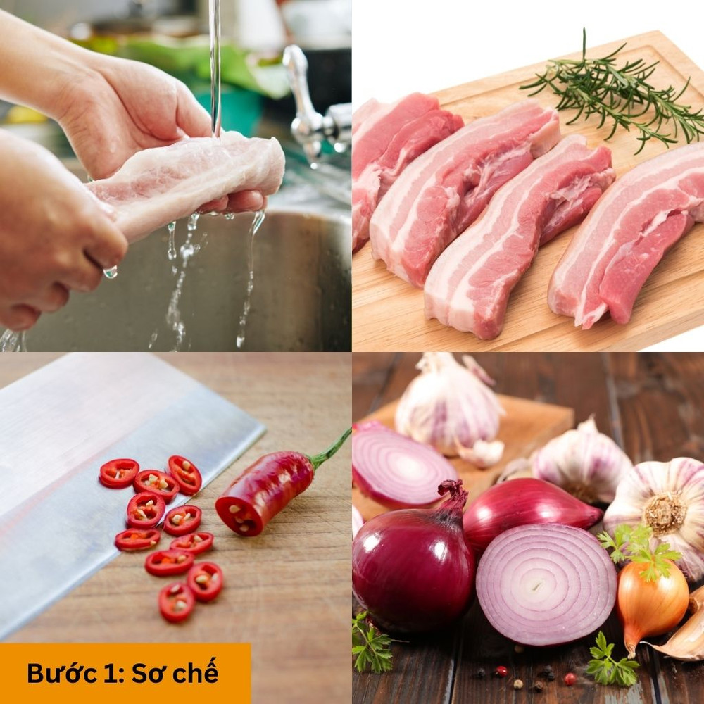 Thịt ba chỉ rửa sạch, để ráo và cắt thành miếng 5-6 cm. Tỏi, hành, ớt cắt lát hoặc băm nhỏ.