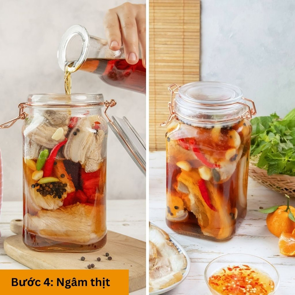 Cho thịt vào lọ sạch thêm tỏi, ớt, hành và đổ nước mắm vào ngập hết phần thịt. Đậy kín nắp, để ở nhiệt độ phòng 1 – 2 ngày.