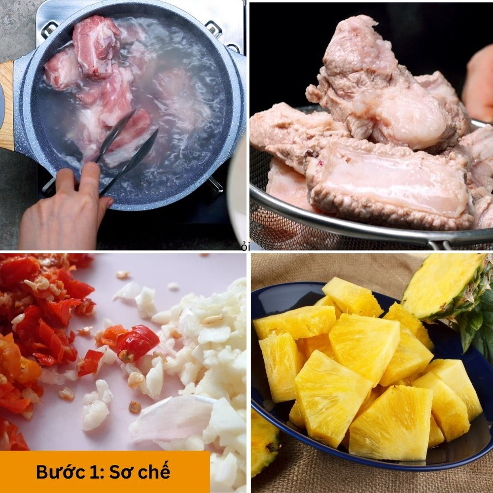 Đun nóng dầu trong chảo, cho thêm hành, tỏi băm sau đó cho thêm dứa vào xào cùng. Rồi cho sườn đảo đều để sườn thấm vị dứa. Thêm nước lọc vừa ngập sườn, đun sôi rồi hạ lửa nhỏ.