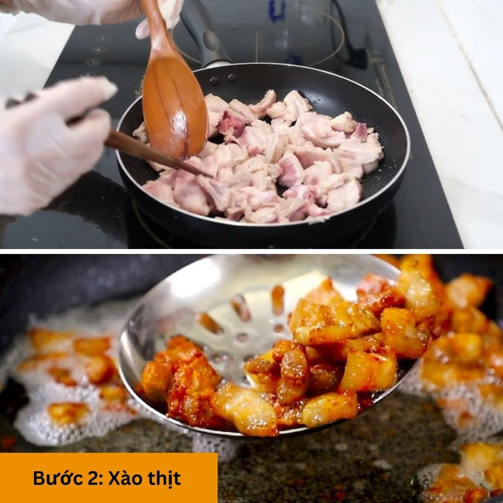 Cho chảo lên bếp, cho thịt vào đảo cho ra mỡ và thịt săn lại.