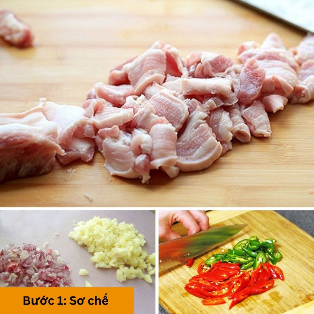 Thịt ba rọi rửa sạch, thái miếng nhỏ. Tỏi, hành băm nhuyễn và ớt thái lát