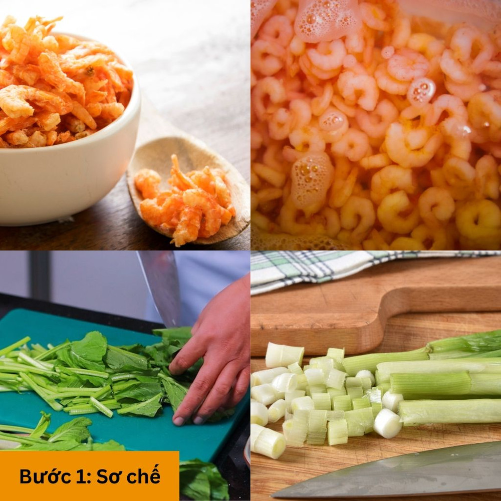 Tôm khô ngâm trong nước khoảng 15 phút cho mềm sau đó rửa lại bằng nước sạch để ráo. Cải ngọt rửa sạch cắt khúc vừa ăn, hành lá cắt nhỏ.