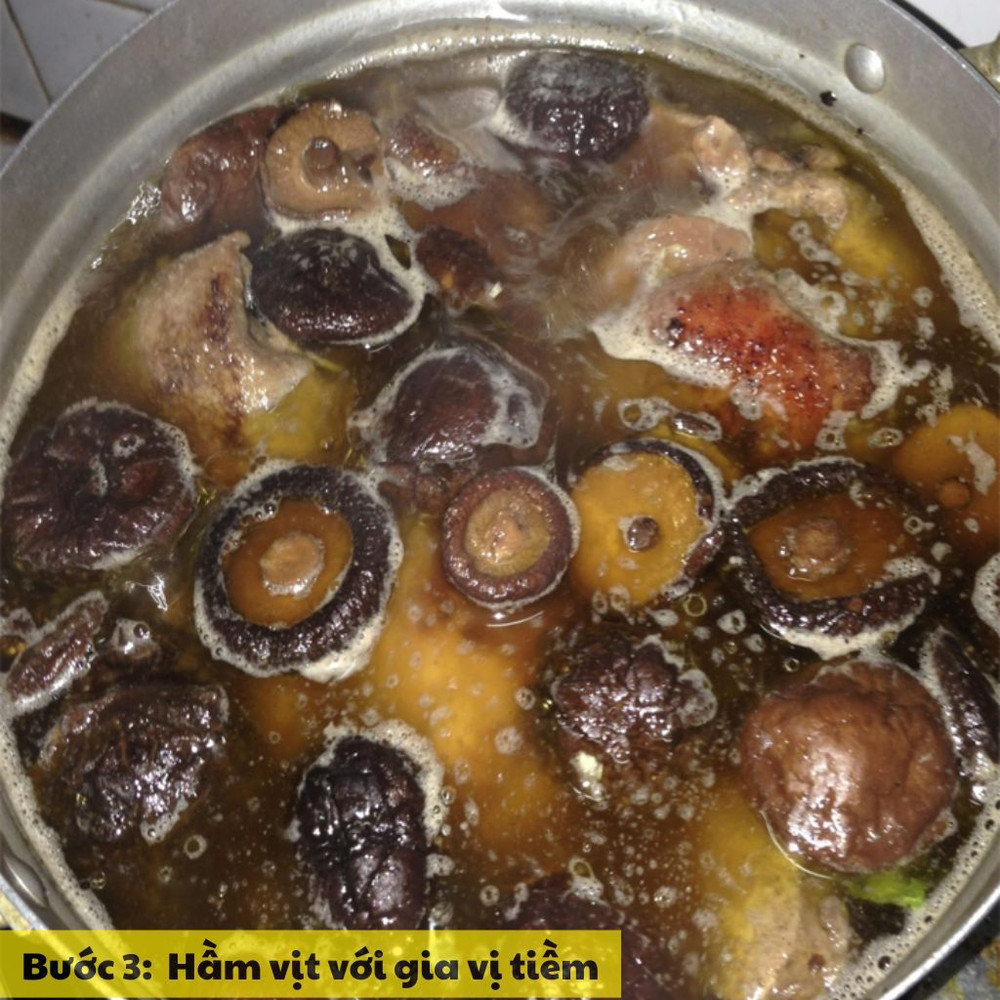 Cho thịt vịt vào nồi, thêm các loại gia vị tiềm như hoa hồi, quế, thảo quả, cùng với nước dùng gà. Hầm nhỏ lửa trong khoảng 60 phút để thịt vịt chín mềm và nước dùng thấm đều gia vị.