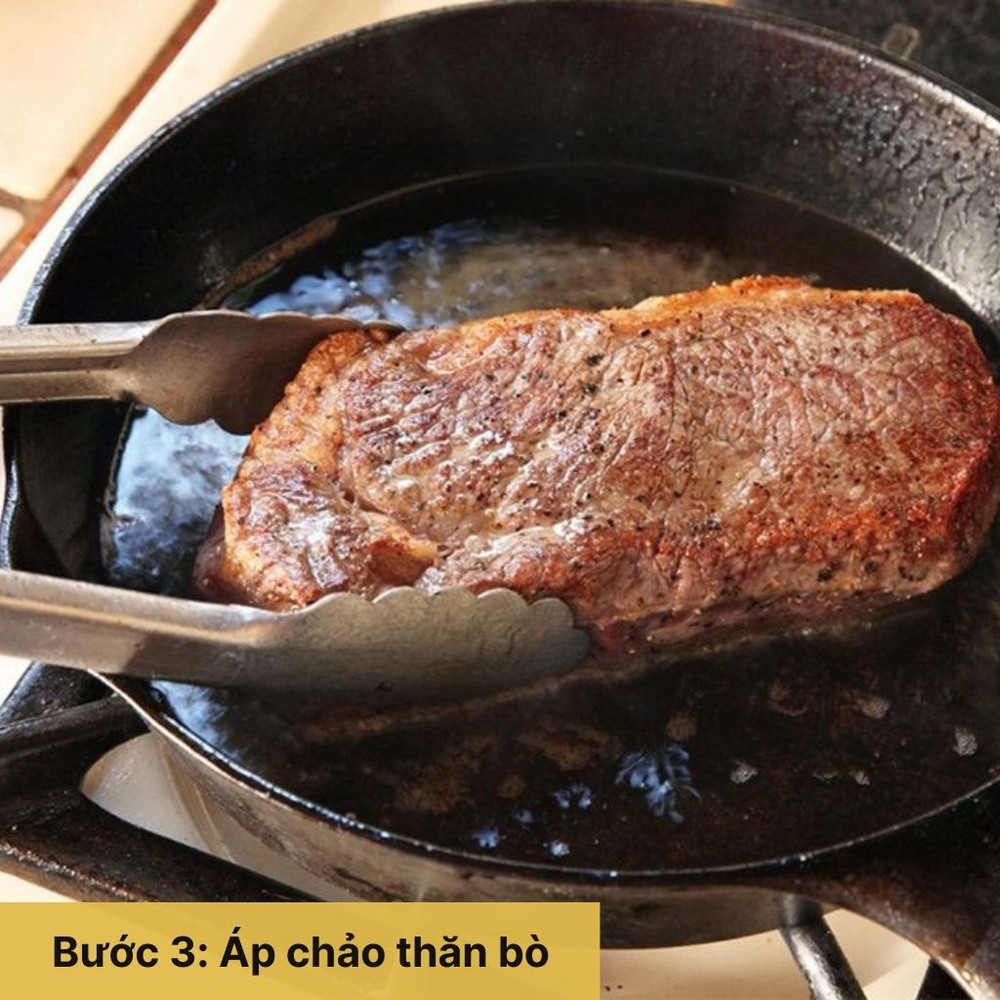 Bắc chảo lên bếp, cho dầu ăn vào đun nóng. Cho thịt bò vào áp chảo mỗi mặt khoảng 3-4 phút.