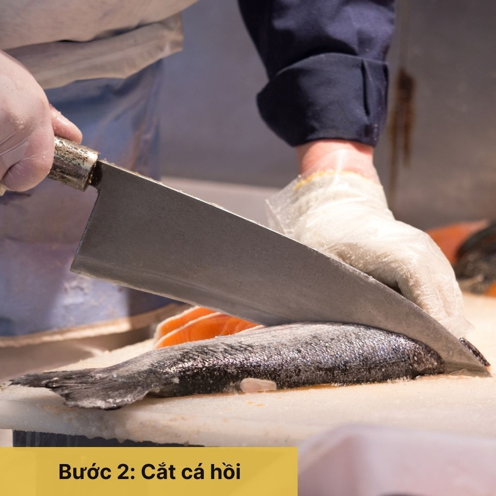 Cá hồi rửa sạch, cắt thành từng miếng vừa ăn.