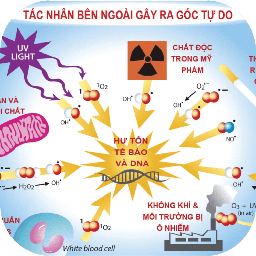 Radical tự do là những phân tử không ổn định có thể gây hại cho cơ thể. Chúng tham gia vào quá trình oxy hóa và có thể gây sự tổn thương cho tế bào. Cơ thể chúng ta có cơ chế tự nhiên để đối phó với radical tự do bằng cách sử dụng enzym như glutathione reductase và glutathione peroxidase, cũng như các chất chống oxi hóa không enzym như vitamin A, E, C, beta carotene, lycopene và selenium.