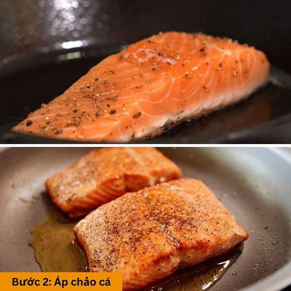 Đun nóng chảo với một chút dầu ăn với lửa vừa. Đặt cá hồi vào chảo, chiên mỗi bên 3 – 4 phút, sau đó lấy cá ra đĩa.