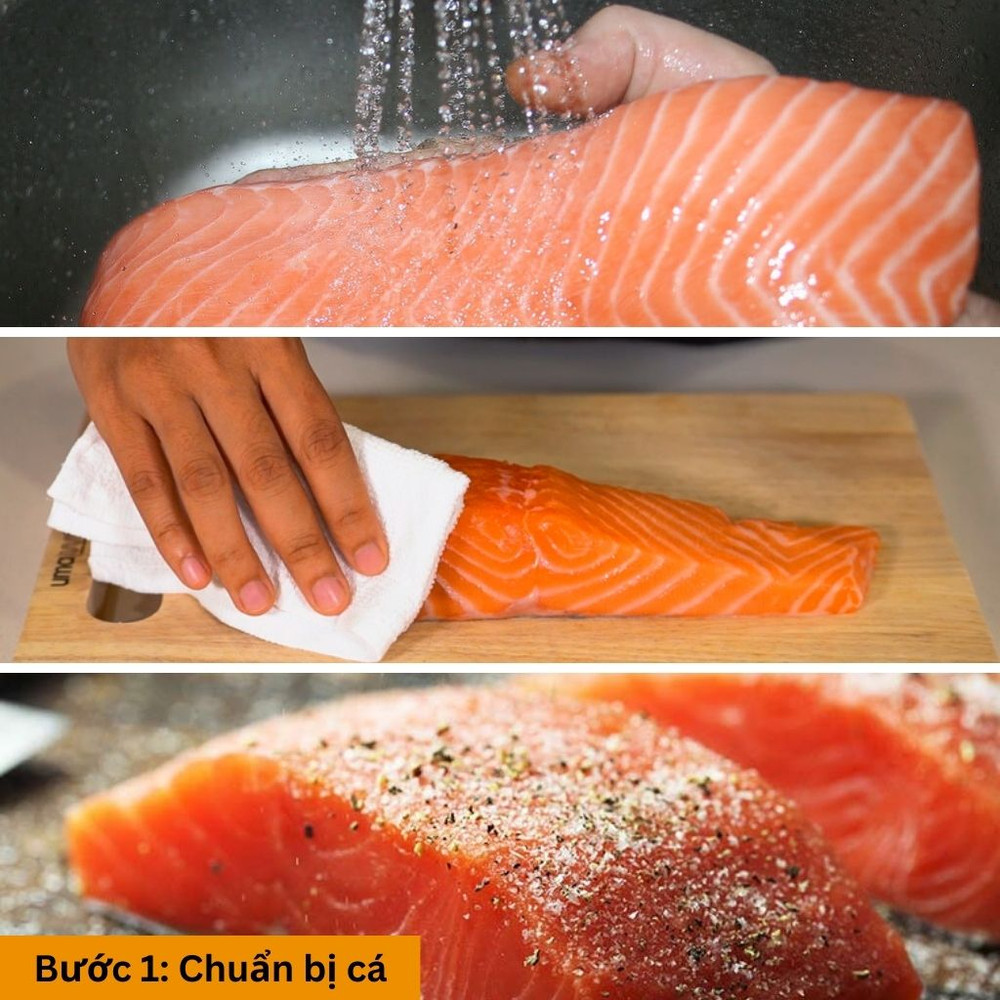 Rửa sạch cá hồi, thấm khô bằng giấy ăn. Sau đó rắc một ít muối và tiêu lên cả hai mặt của miếng cá