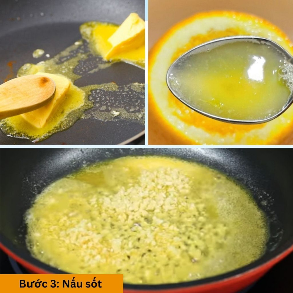 Tiếp tục cho bơ vào đun chảy trên lửa nhỏ, cho tỏi băm vào phi thơm. Sau cùng, thêm nước cốt chanh vào khuấy đều