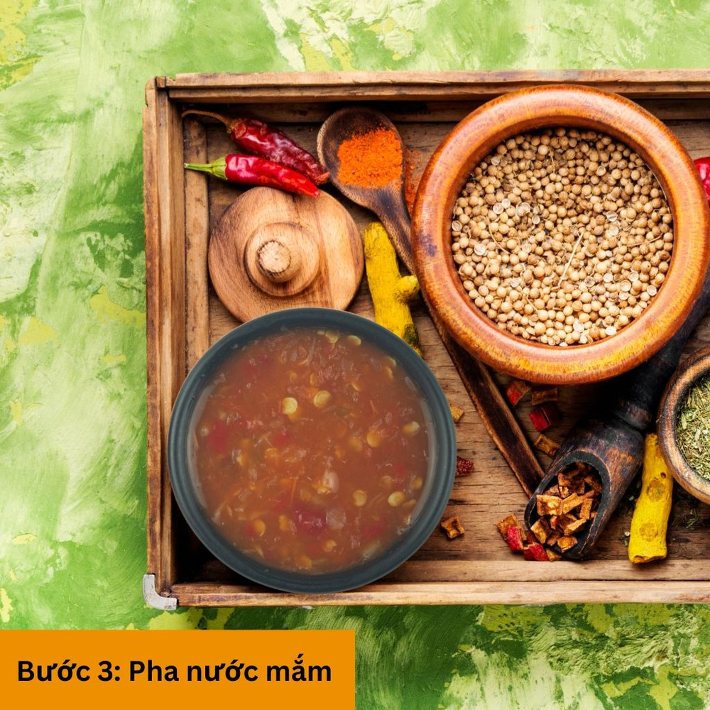 Trộn 2 muỗng canh nước mắm, 1 muỗng canh đường, tỏi băm, ớt băm, hạt nêm, bột ngọt và tiêu vào chén, khuấy đều.
