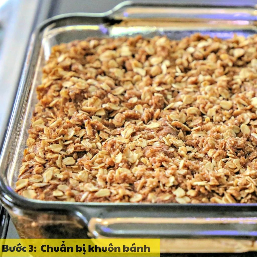 Phết một lớp dầu dừa vào khuôn bánh để chống dính. Đổ hỗn hợp chuối yến mạch đã trộn vào khuôn, dàn đều mặt bánh để bánh nở đều khi nướng.