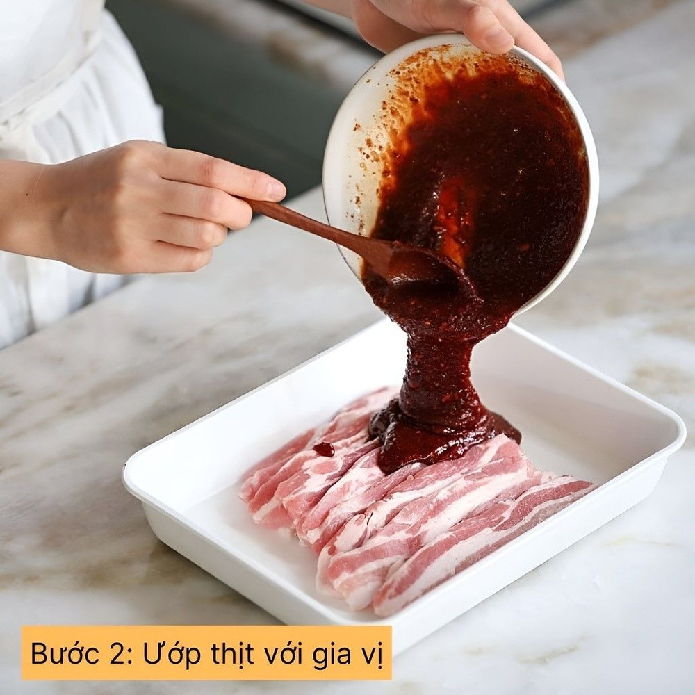 Nướng thịt trên bếp than hoặc chảo nướng, trở đều cho đến khi thịt heo chín vàng và thơm.