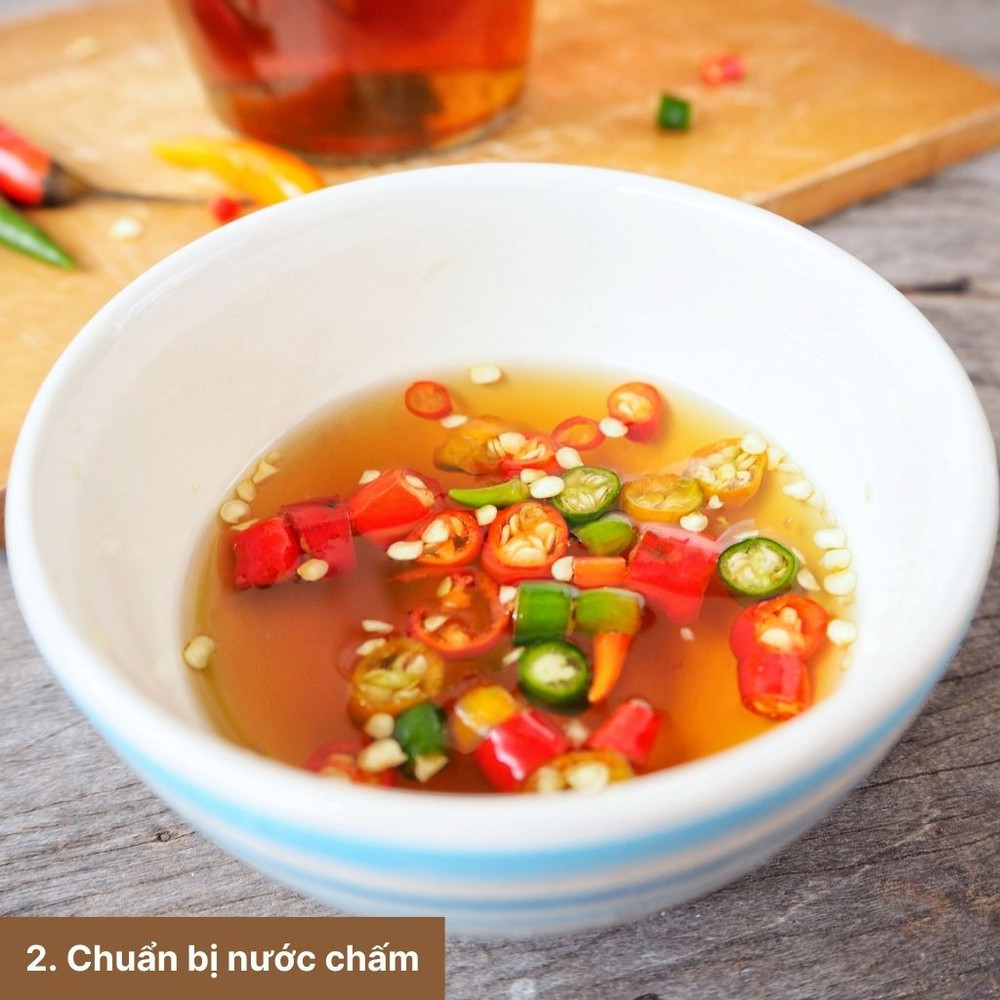 Trộn nước mắm, nước cốt chanh, đường, tỏi băm và ớt băm để làm nước chấm. Khuấy đều cho đến khi đường tan. Có thể dùng nước tương thay thế tùy theo khẩu vị.