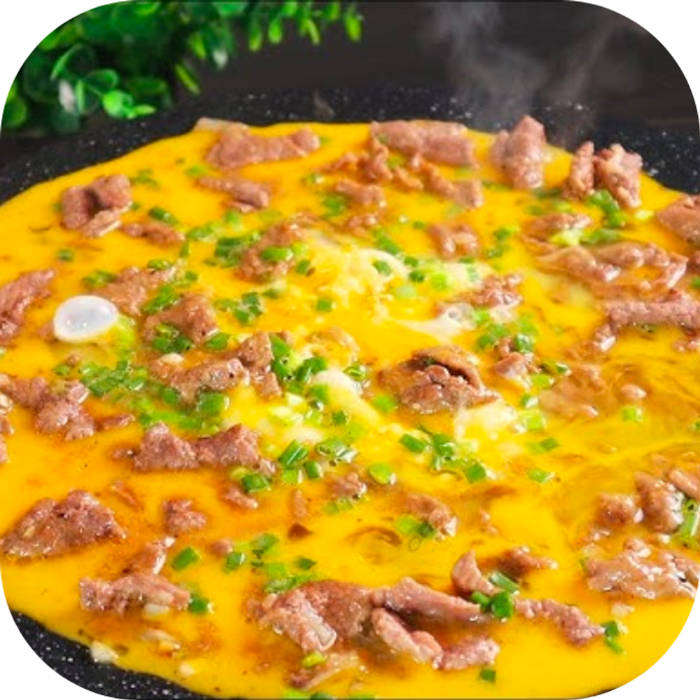 - Trước hết, đặt một chiếc chảo lên bếp và đun nóng. Sau đó, thêm một ít dầu ăn để sôi. Đun nóng dầu, sau đó thả thịt bò vào chảo và xào trong vòng 1 phút. Tiếp theo, chuyển thịt bò vào bát chứa trứng đã đánh, sau đó thêm hành lá và khuấy đều. Trên cùng một chiếc chảo, thêm thêm dầu và đun nóng. Khi dầu nóng, đổ trứng vào chiếc chảo. Khi trứng khô, lật trứng để đảm bảo mặt trên trứng được nấu đều. Khi trứng đã chín, tắt bếp, rắc tiêu và trình bày món ăn lên đĩa.
