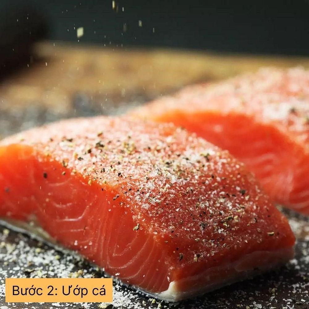 Ướp cá hồi với nước mắm và tiêu. Để cá hồi ngấm gia vị trong 15 phút.