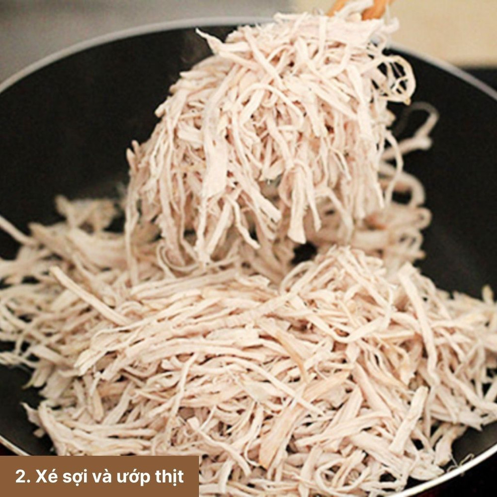Sau khi luộc, vớt thịt ra để nguội, sau đó dùng tay xé sợi nhỏ. Ướp thịt với nước mắm, đường, hạt nêm, và hành tím băm trong 15 phút.
