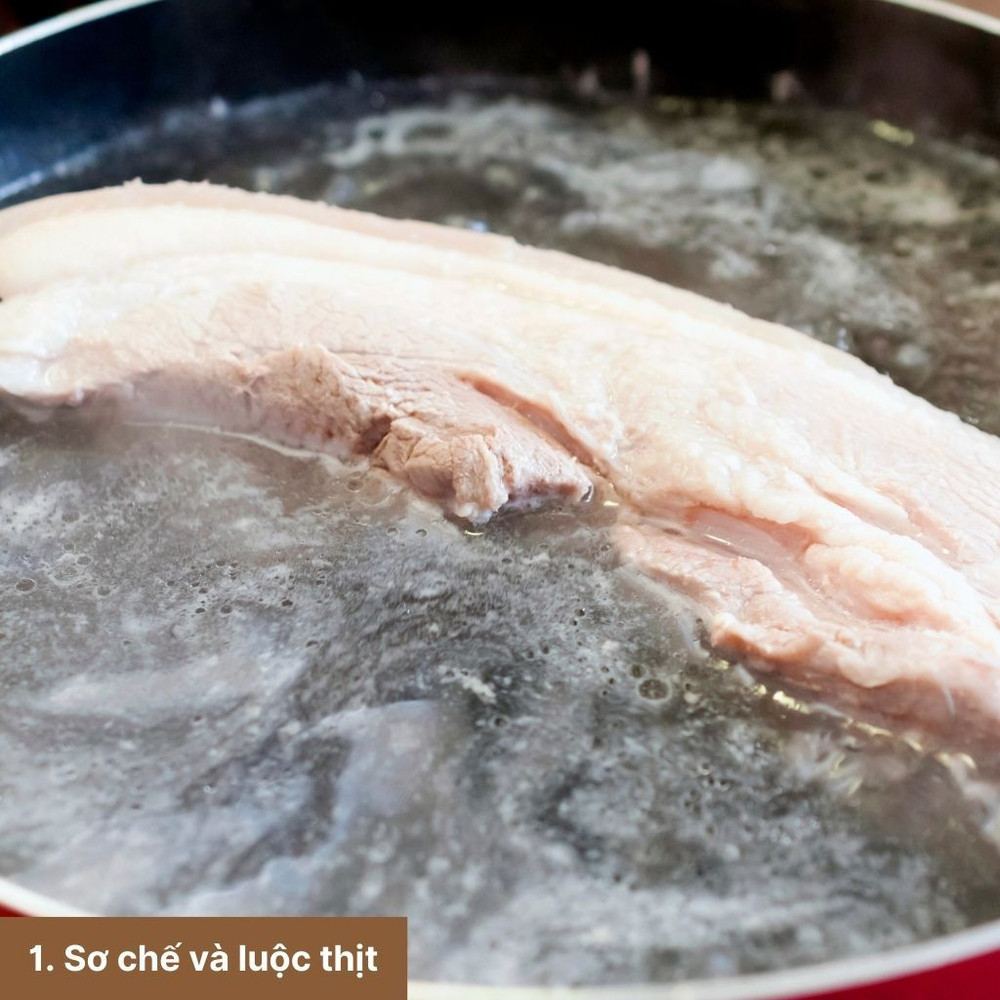 Rửa sạch thịt heo, để ráo, cắt miếng lớn. Cho thịt vào nồi nước sôi, thêm chút muối, luộc trong 30 phút đến khi thịt chín mềm.