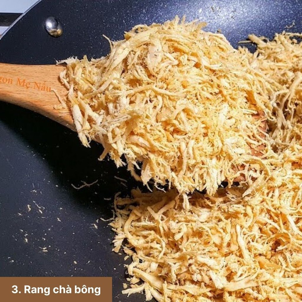 Cho thịt đã ướp vào chảo, đảo đều trên lửa nhỏ cho đến khi thịt khô và vàng đều. Có thể dùng cối giã nhẹ để chà bông bông mềm.
