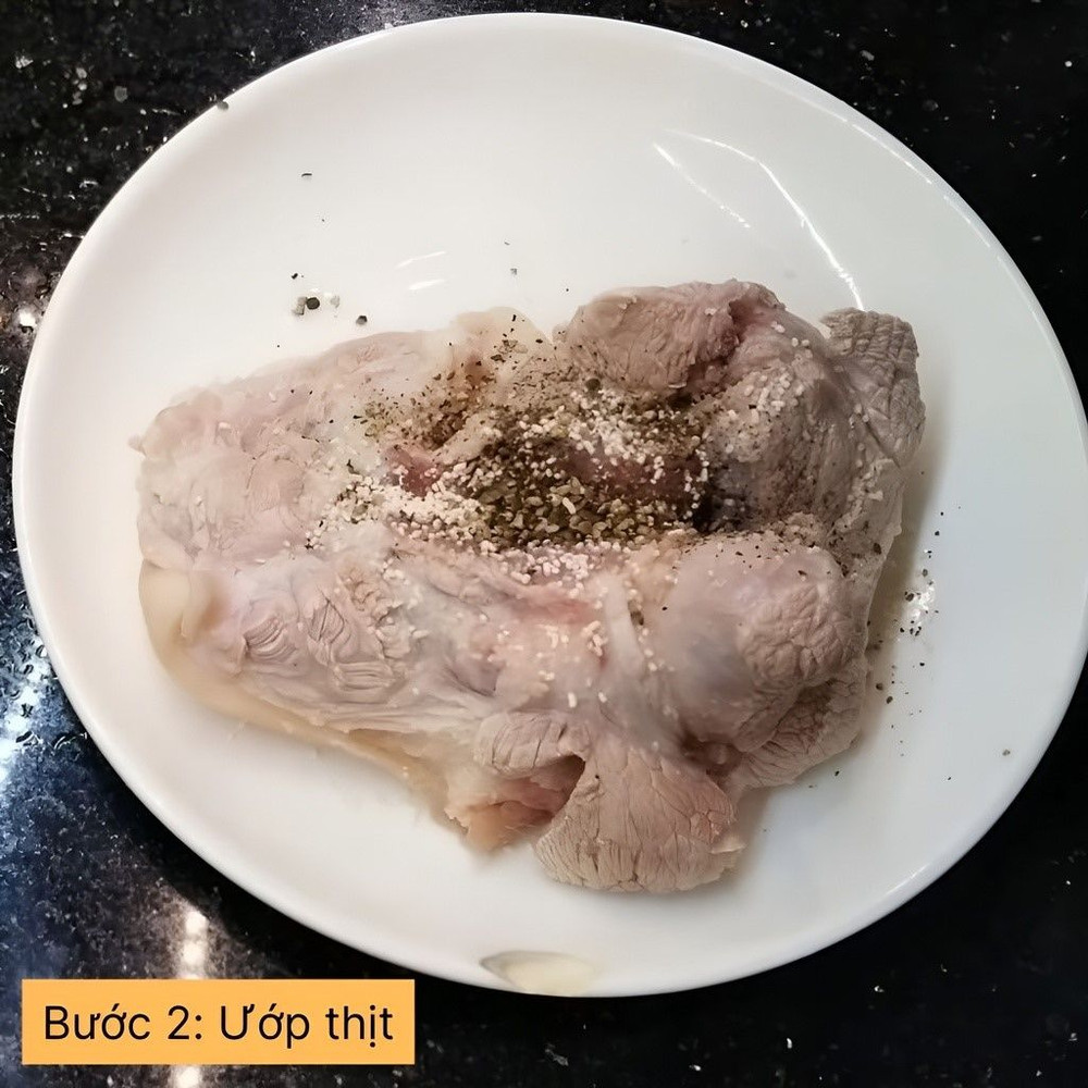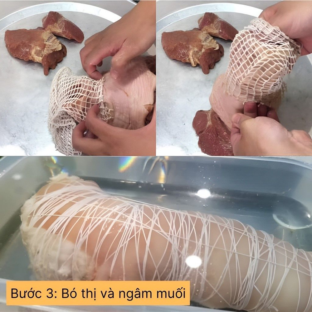 Đem hoà 2 muỗng canh muối trong một nồi nước đun sôi để nguội. Cho thịt vào hộp, sau đó đổ hỗn hợp muối loãng vào ngập thịt, đậy nắp lại, cho vào trong ngăn mát tủ lạnh ngâm trong 2 ngày.