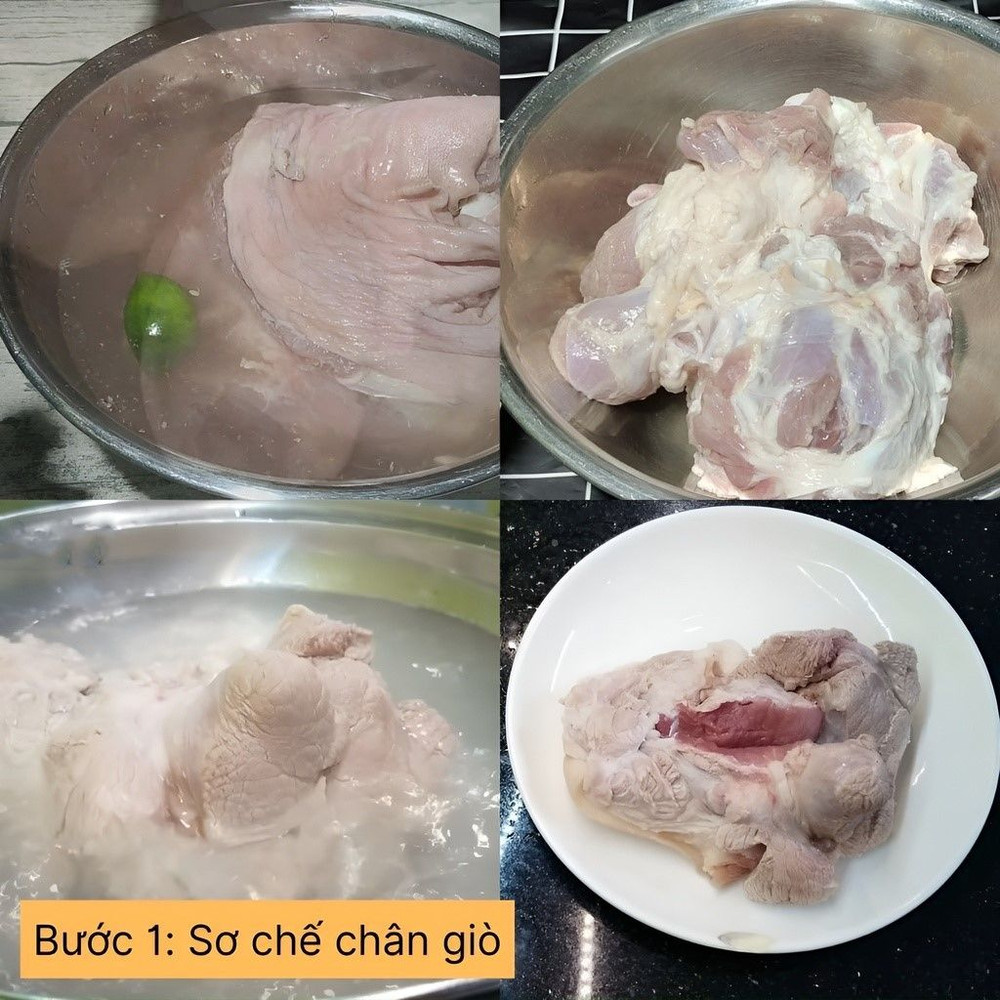 Chân giò rửa sạch, có thể ngâm nước muối loãng khoảng 5-10 phút để khử mùi, sau đó rửa lại với nước sạch và để ráo. Luộc sơ chân gà vừa chín bên ngoài.