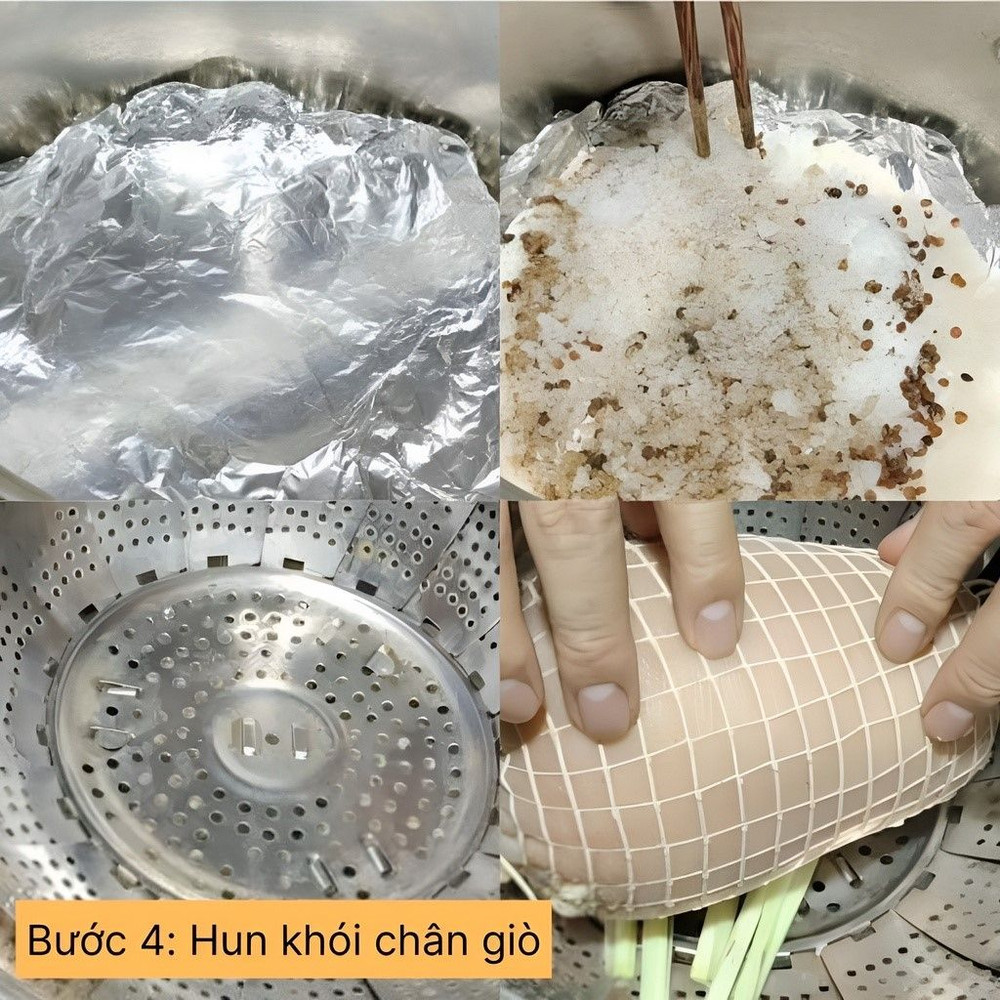 Rang hạt mắc kén, hoa tiêu, tiêu sọ, đại hồi, thảo quả, hạt dổi, Cắt màng nhôm lót vào dưới đáy nồi và cho hỗn hợp đã rang lên. Sau đó cho gạo, muối, đường trên màng nhôm. Thịt chân giò cần được hun khói trong vòng 1 tiếng.
