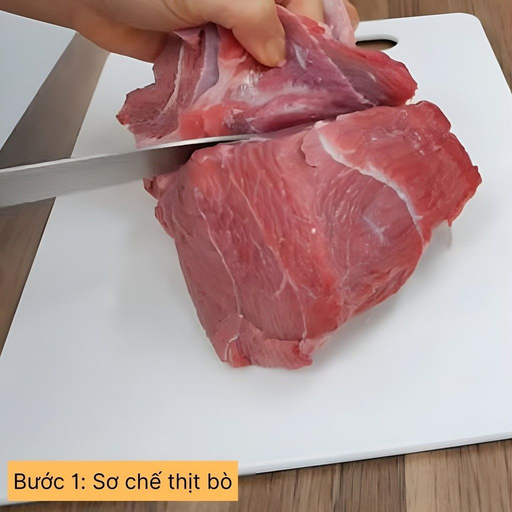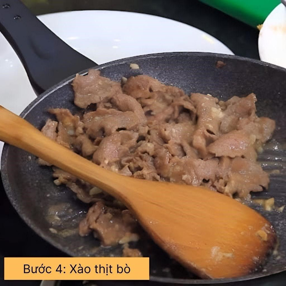 Rửa sạch thịt bò dưới vòi nước, sau đó thấm khô bằng khăn giấy để tránh nước làm thịt bị dính khi xào. Cắt thịt bò thành những lát mỏng