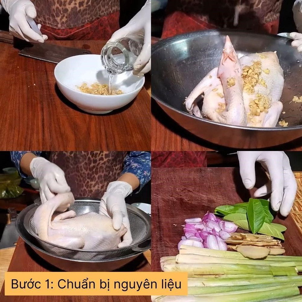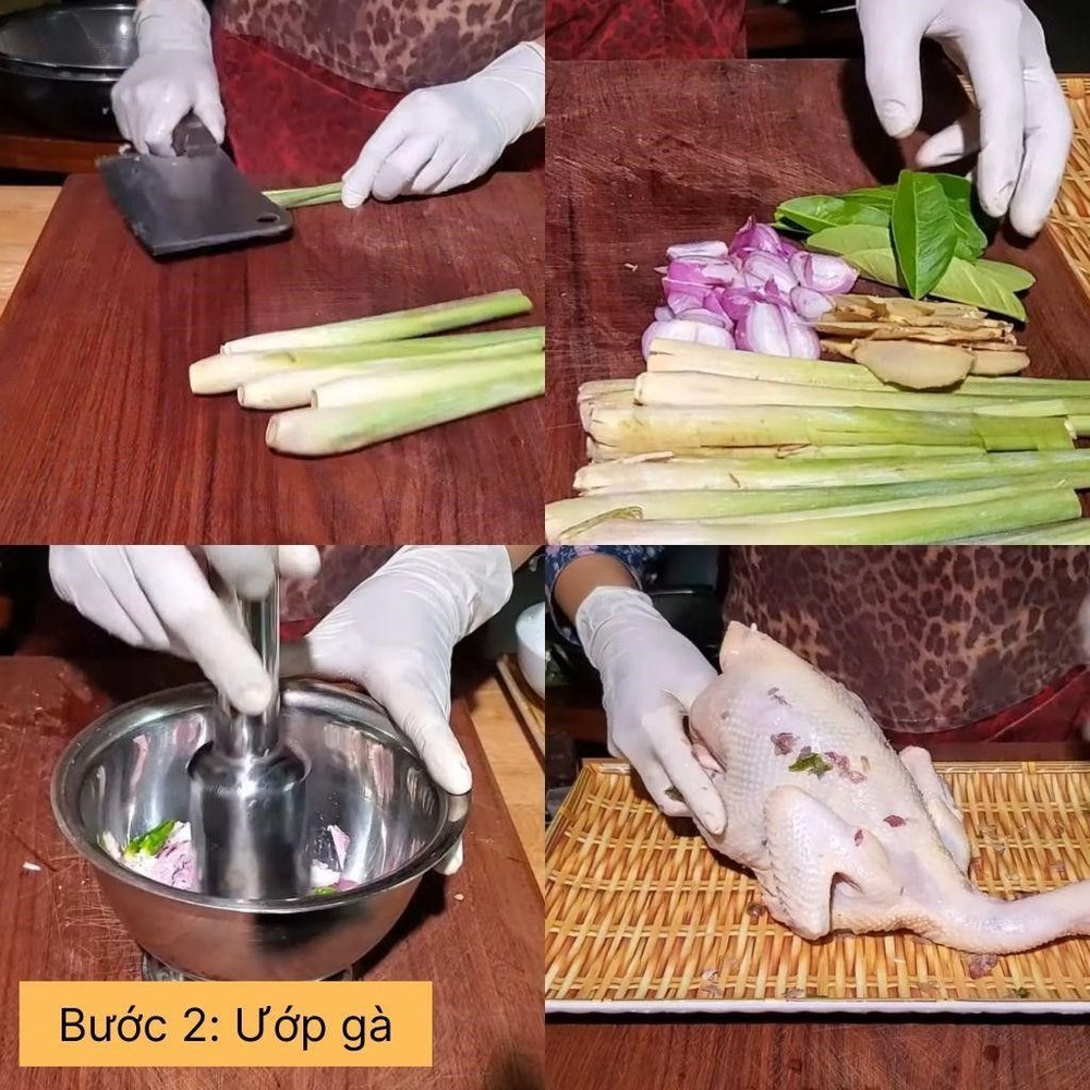 Đập dập xả, giã nhuyễn sả, lá chanh, hành tím, gừng. Xoa cả bên ngoài và bên trong bụng gà. Có thể nhét vài lá sả và lá chanh vào bụng gà để thịt gà thơm hơn khi hấp.