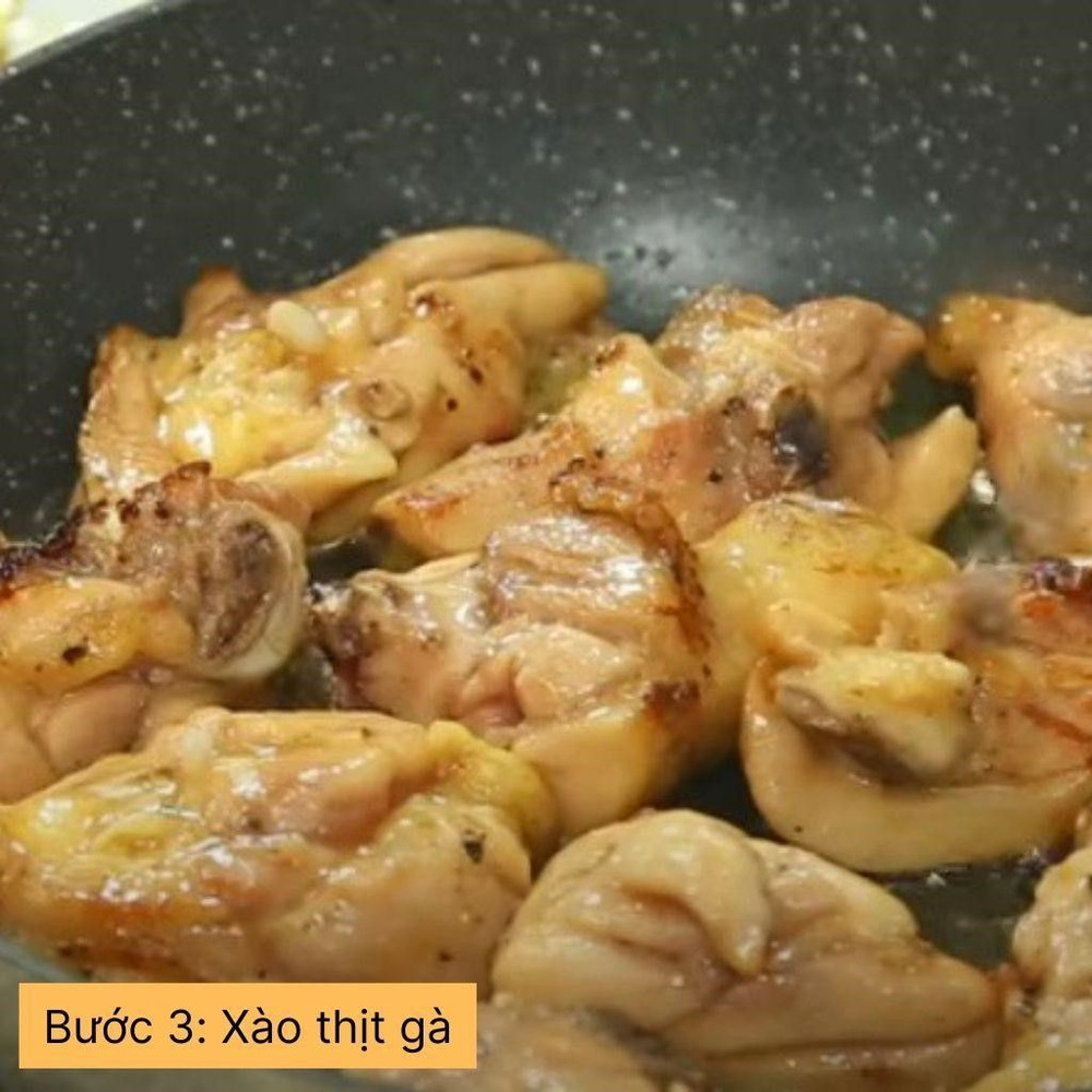 Phi thơm hành tím và tỏi với dầu ăn. Cho thịt gà vào xào săn.