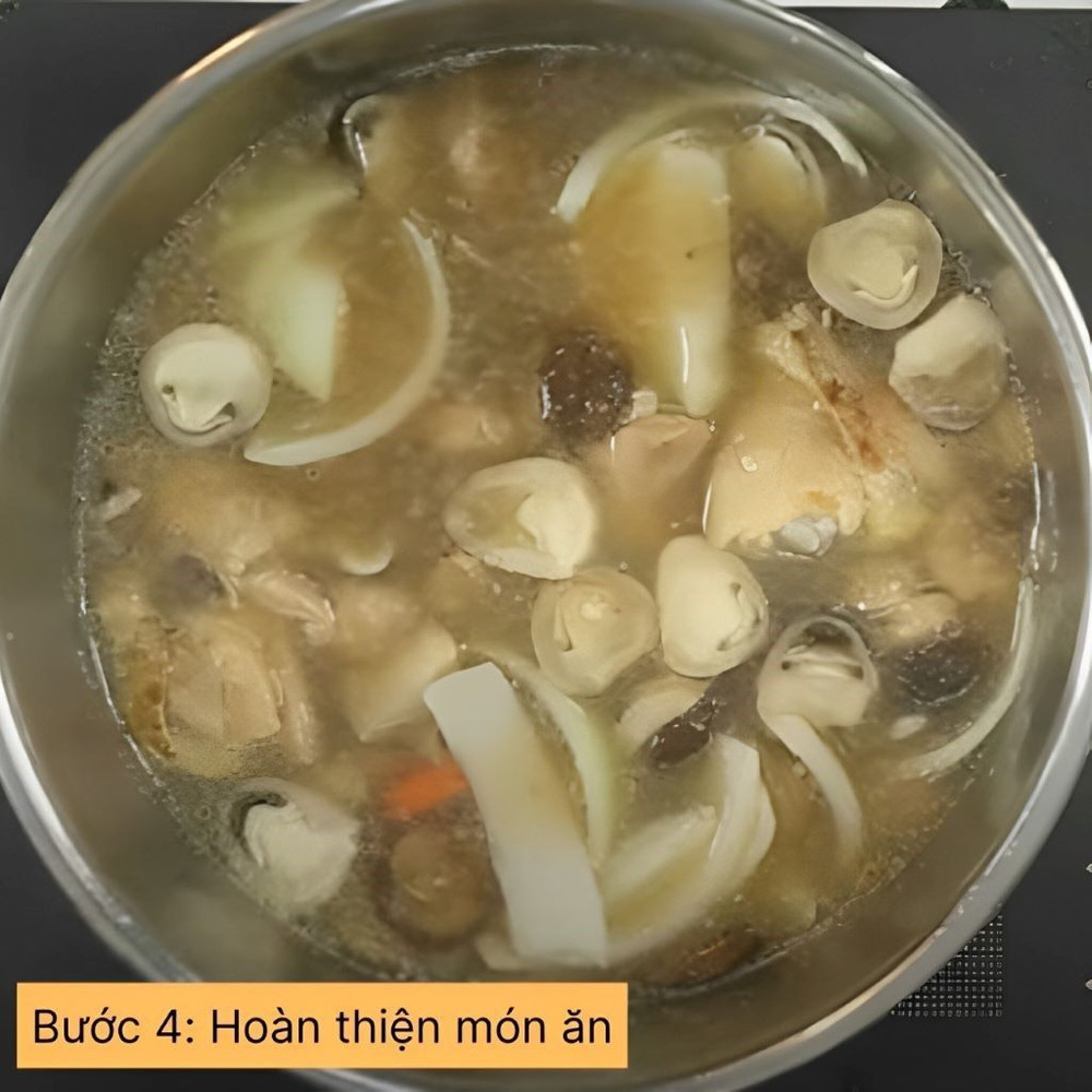 Sau đó, đổ nước vào nồi sao cho ngập gà. Cho nấm rơm và nấm hương vào. Nấu thêm 10-15 phút đến khi thịt gà mềm và nấm chín. Thêm hành lá, ngò rí và nêm nếm lại gia vị cho vừa ăn rồi tắt bếp.