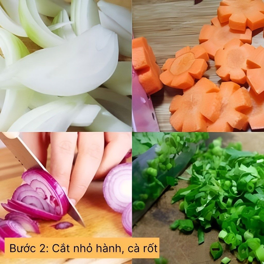 Xắt nhỏ hành lá. Cắt hành tây, cà rốt, hàm tím thành miếng vừa ăn.
