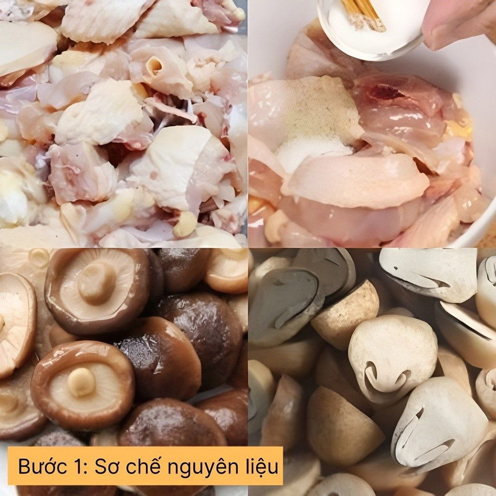 Rửa sạch thịt gà, cắt miếng vừa ăn. Ướp thịt gà với nước mắm, hạt nêm, tiêu trong 15 phút. Nấm rơm và nấm đông cô rửa sạch, để ráo nước.