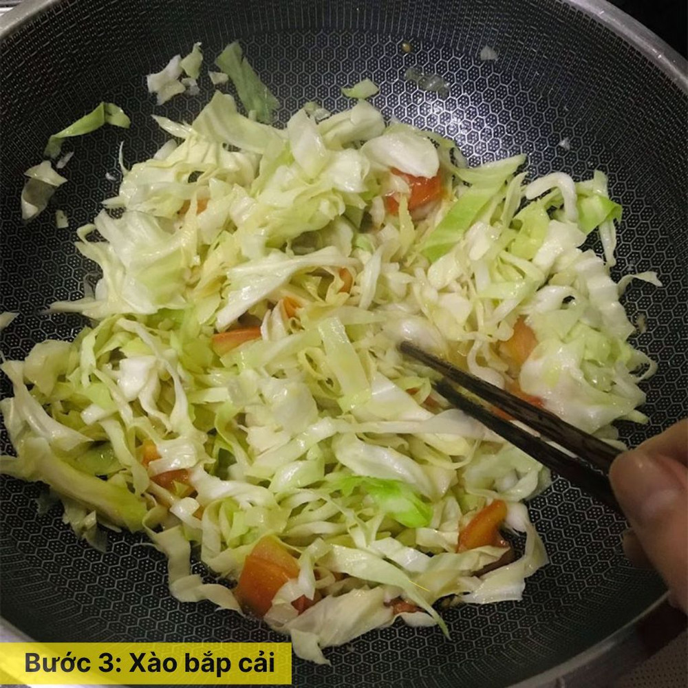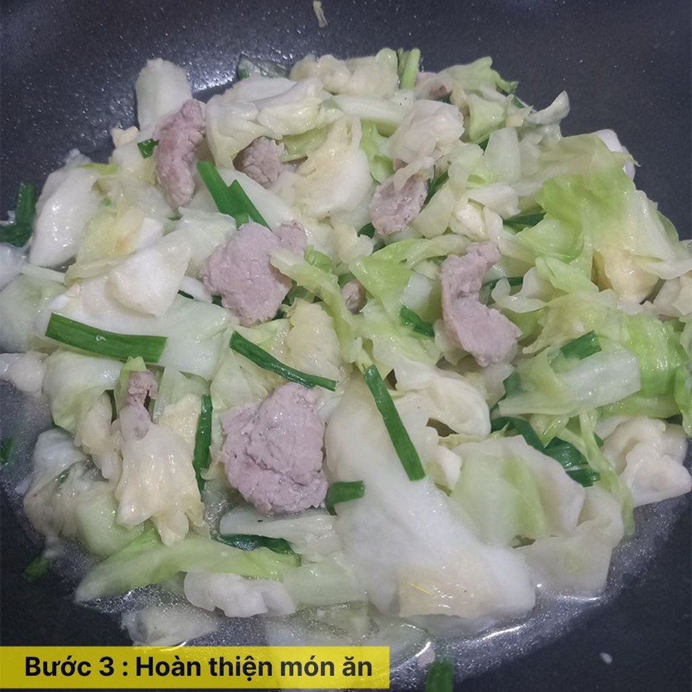 Thêm bắp cải vào chảo, đảo đều cho bắp cải trộn lẫn với thịt gà và thấm đều gia vị. Xào đến khi bắp cải chín tới nhưng vẫn giữ độ giòn, nêm thêm muối và tiêu nếu cần.