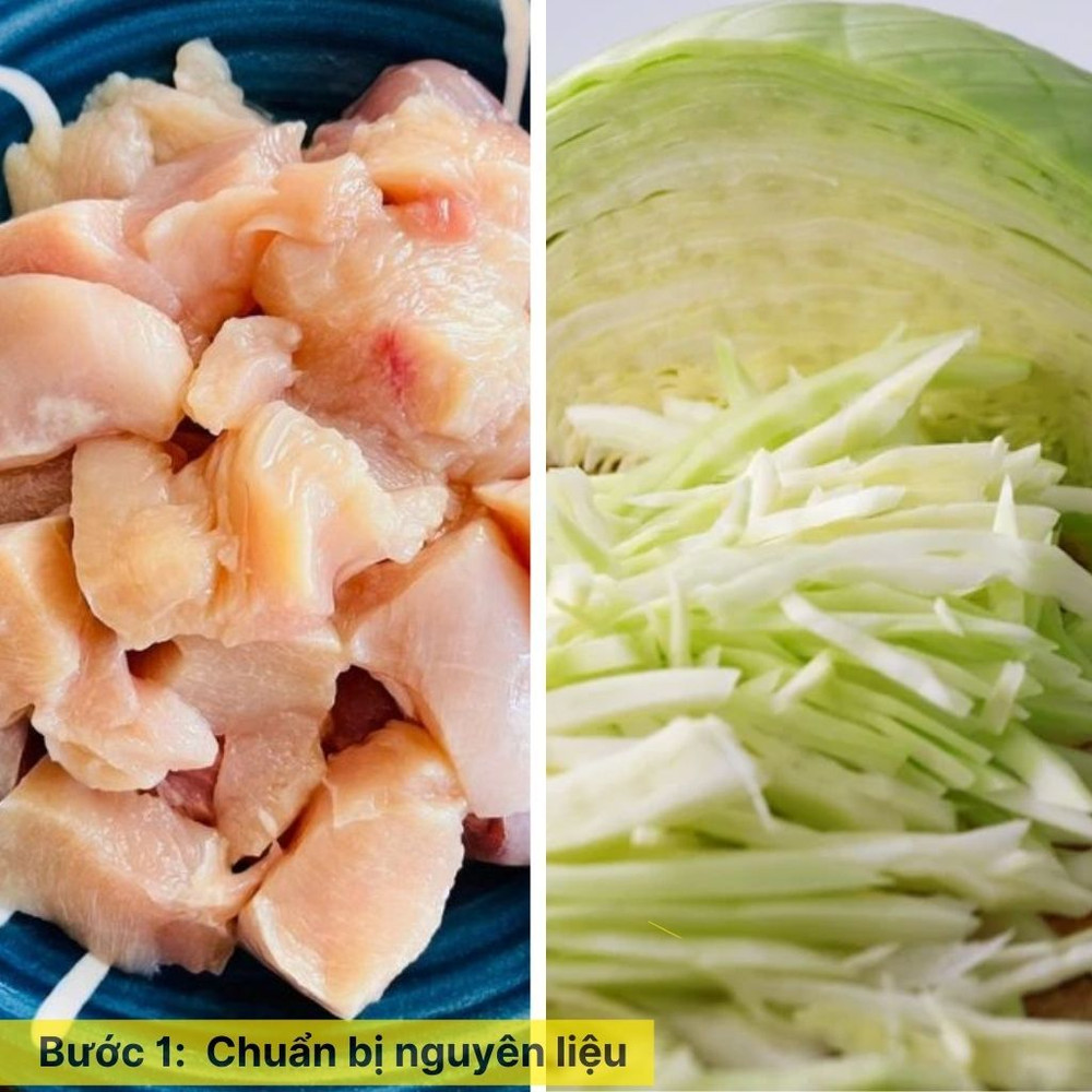 Thịt gà rửa sạch, thái lát mỏng hoặc miếng vừa ăn. Ướp với một ít muối, hạt tiêu và hạt nêm để thấm gia vị. Bắp cải rửa sạch, thái sợi hoặc miếng vừa ăn. Hành lá rửa sạch, cắt khúc.