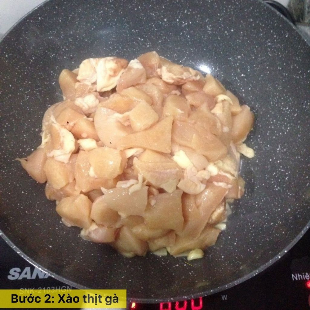 Đun nóng dầu ăn trong chảo, cho hành tím và tỏi băm vào phi thơm đến khi dậy mùi. Cho thịt gà vào chảo, xào trên lửa vừa đến khi thịt săn lại và chín đều. Thêm nước mắm vào để thịt gà thấm vị, xào khoảng 2-3 phút nữa.