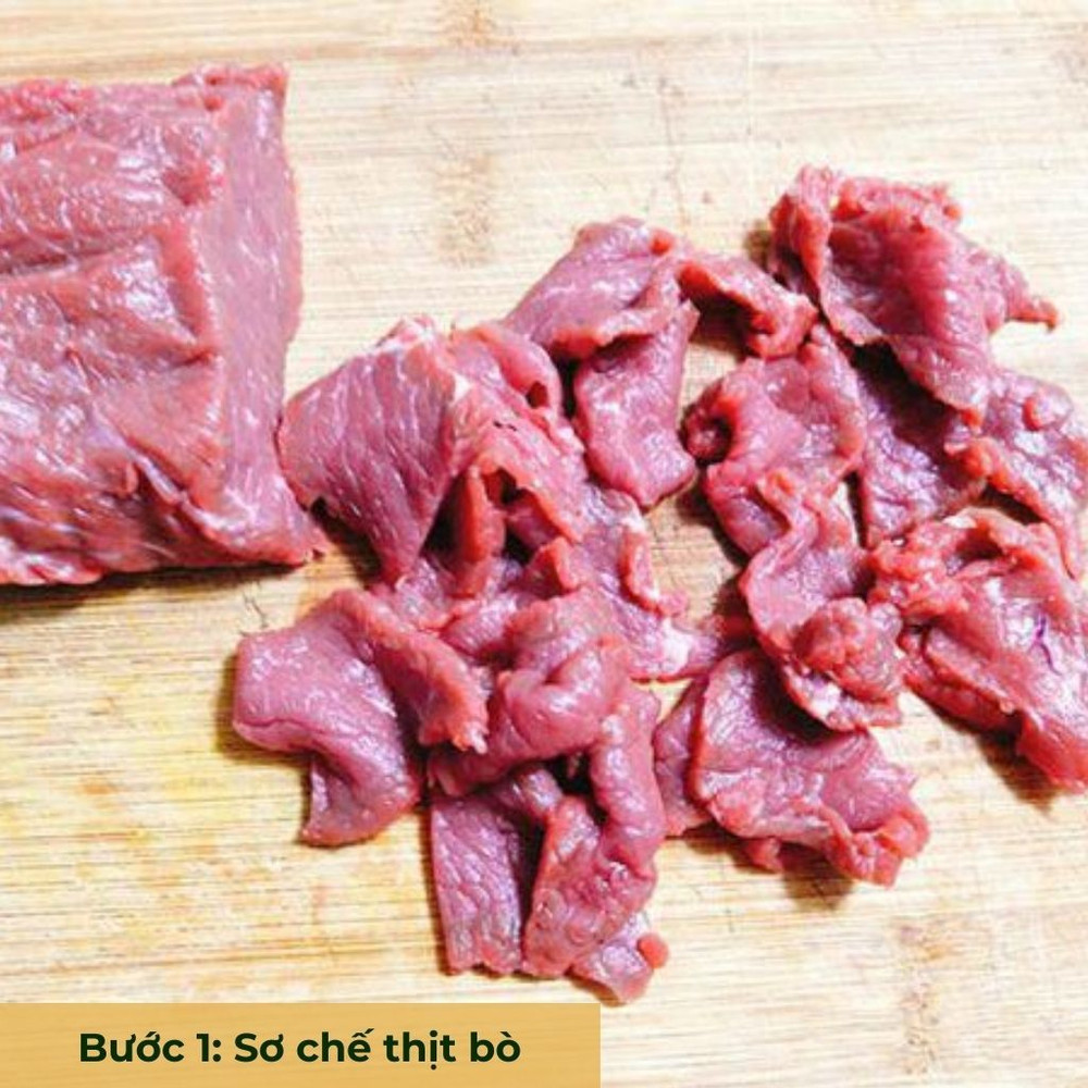 Làm nóng chảo với chút dầu, xào thịt bò trên lửa lớn cho đến khi chín tái. Sau đó, bày ra đĩa cho nguội.