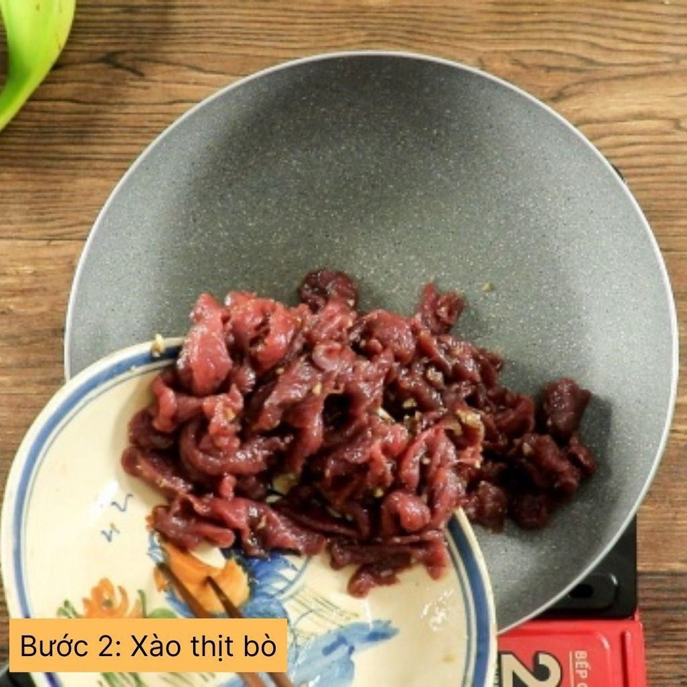 Bắc chảo lên bếp, cho chút dầu oliu vào chảo. Khi dầu nóng, cho thịt bò vào xào nhanh trên lửa lớn khoảng 1-2 phút đến khi thịt bò vừa chín tới, giữ độ mềm. Tắt bếp và để nguội.