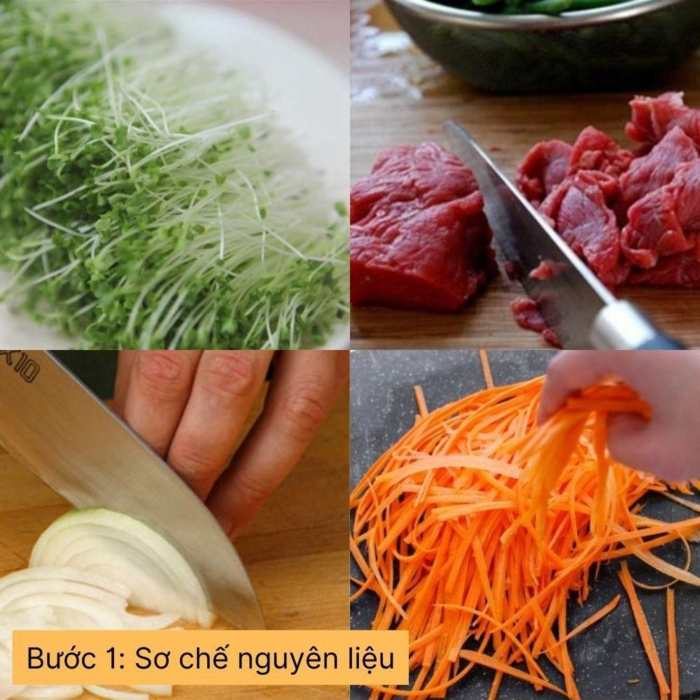 Thịt bò rửa sạch, thái lát mỏng. Hành tây thái lát mỏng và ngâm vào nước đá để bớt hăng. Rửa sạch rau mầm và rau thơm, để ráo nước. Cà rốt rửa sạch, bào sợi mỏng.