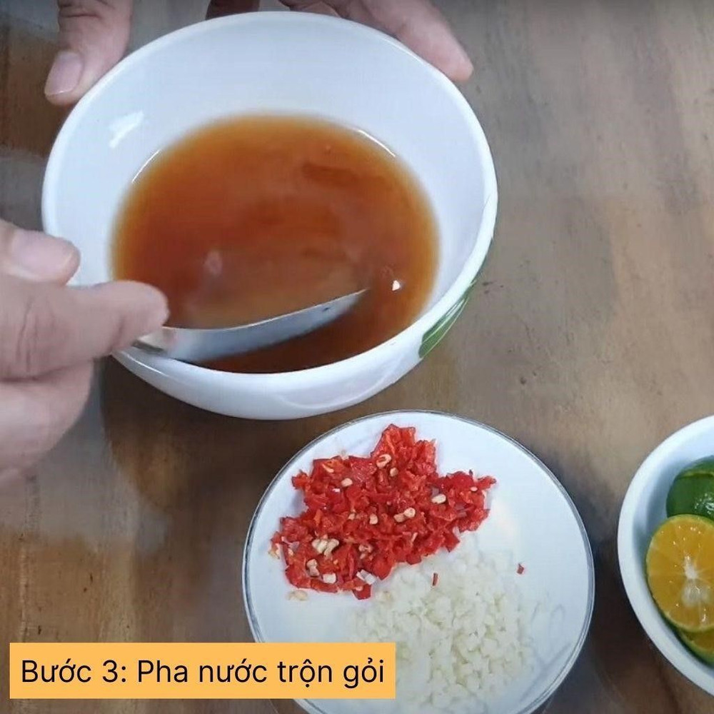 Trong tô nhỏ, hòa nước mắm, đường, nước cốt chanh, tỏi và ớt băm. Khuấy đều để đường tan hoàn toàn.