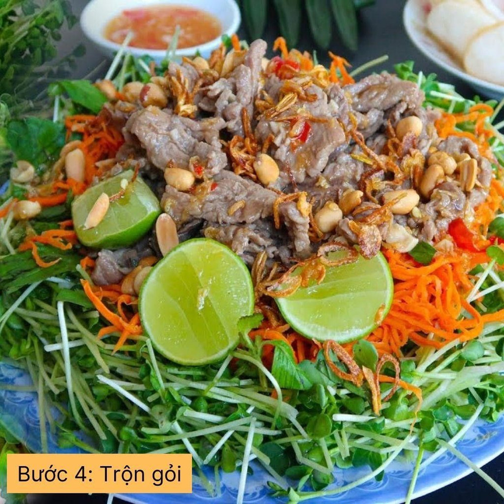 Cho rau mầm, hành tây, cà rốt, thịt bò xào và rau thơm vào tô lớn. Rưới nước trộn gỏi lên, nhẹ nhàng trộn đều để các nguyên liệu ngấm gia vị.