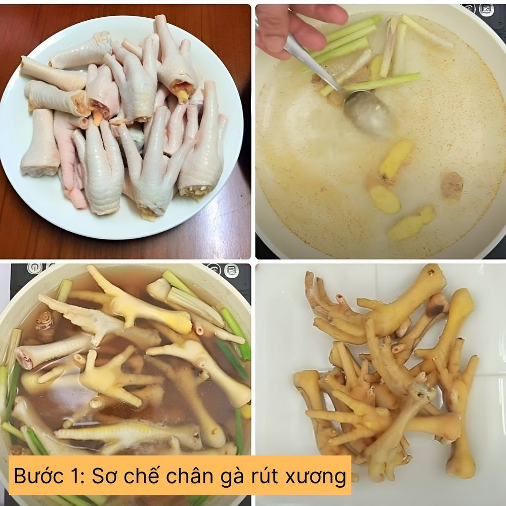 Rửa sạch chân gà với nước muối loãng, sau đó luộc trong 15 phút với vài lát gừng. Vớt ra, để nguội rồi rút xương chân gà.