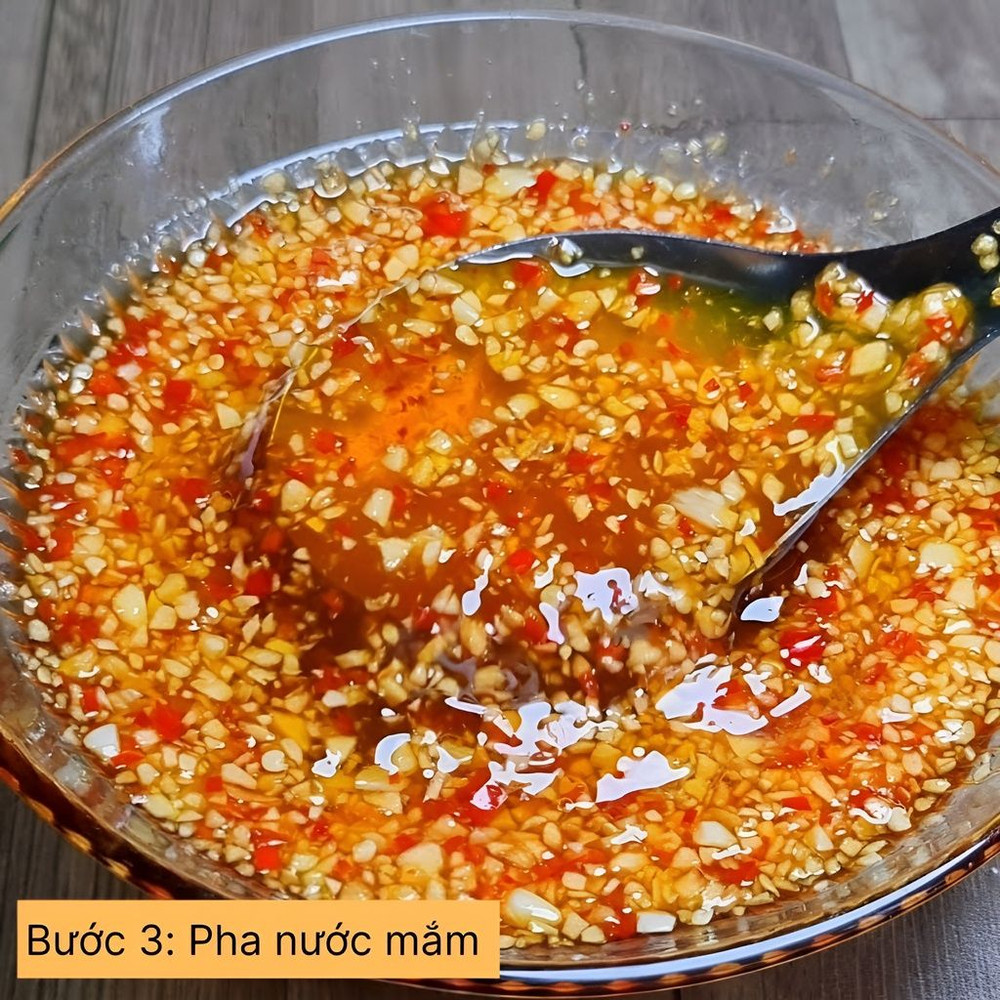 Trộn nước mắm, đường, nước cốt chanh, tỏi và ớt băm nhỏ thành hỗn hợp nước trộn gỏi chua ngọt.