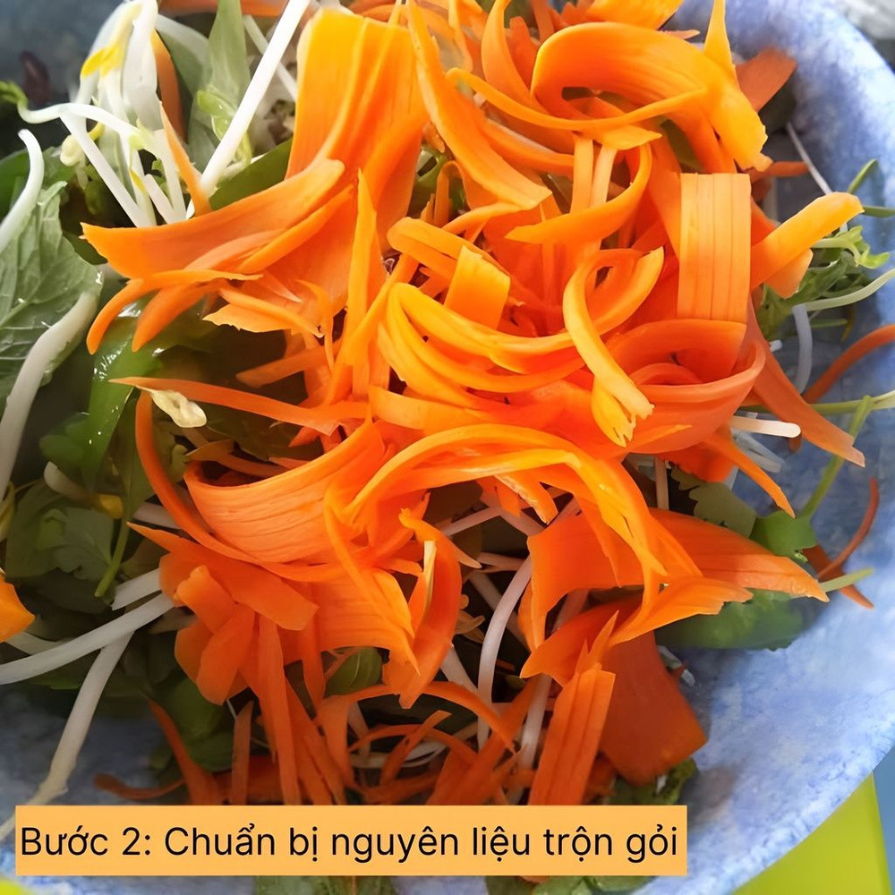 Cà rốt bào sợi, dưa leo thái mỏng, hành tây thái mỏng ngâm với giấm và đường cho bớt hăng. Rau răm nhặt rửa sạch.