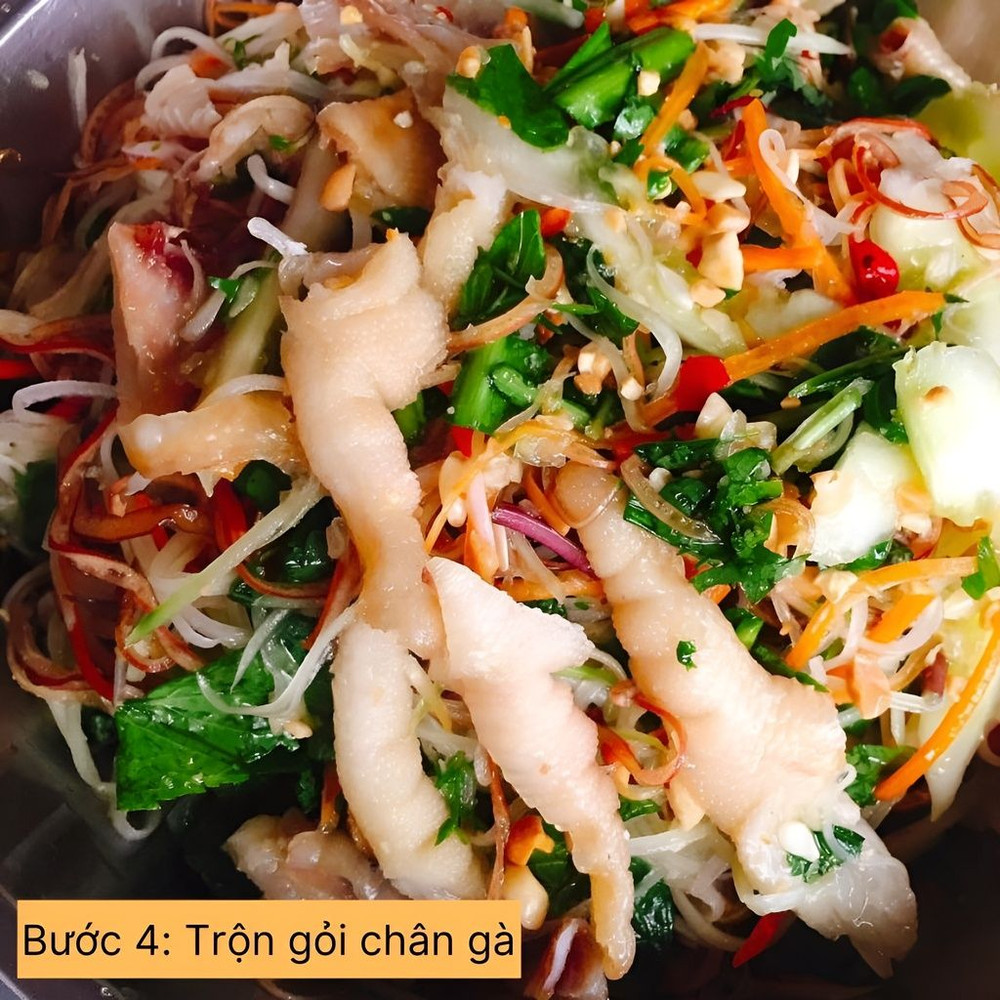 Gỏi chân gà rút xương là món ăn ngon miệng với hương vị thanh mát, giòn giòn của chân gà kết hợp cùng vị chua ngọt từ nước trộn gỏi. Món này rất thích hợp cho những bữa ăn nhẹ hoặc làm món nhậu cùng bạn bè.