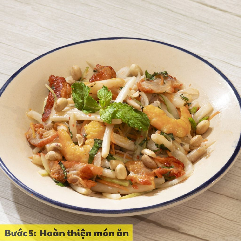 Sau khi trộn đều, bày gỏi ra đĩa, rắc đậu phộng rang và rau răm lên trên để tăng thêm hương vị. Món gỏi ngó sen tôm thịt sẽ ngon hơn khi dùng kèm với bánh phồng tôm hoặc cơm nóng.